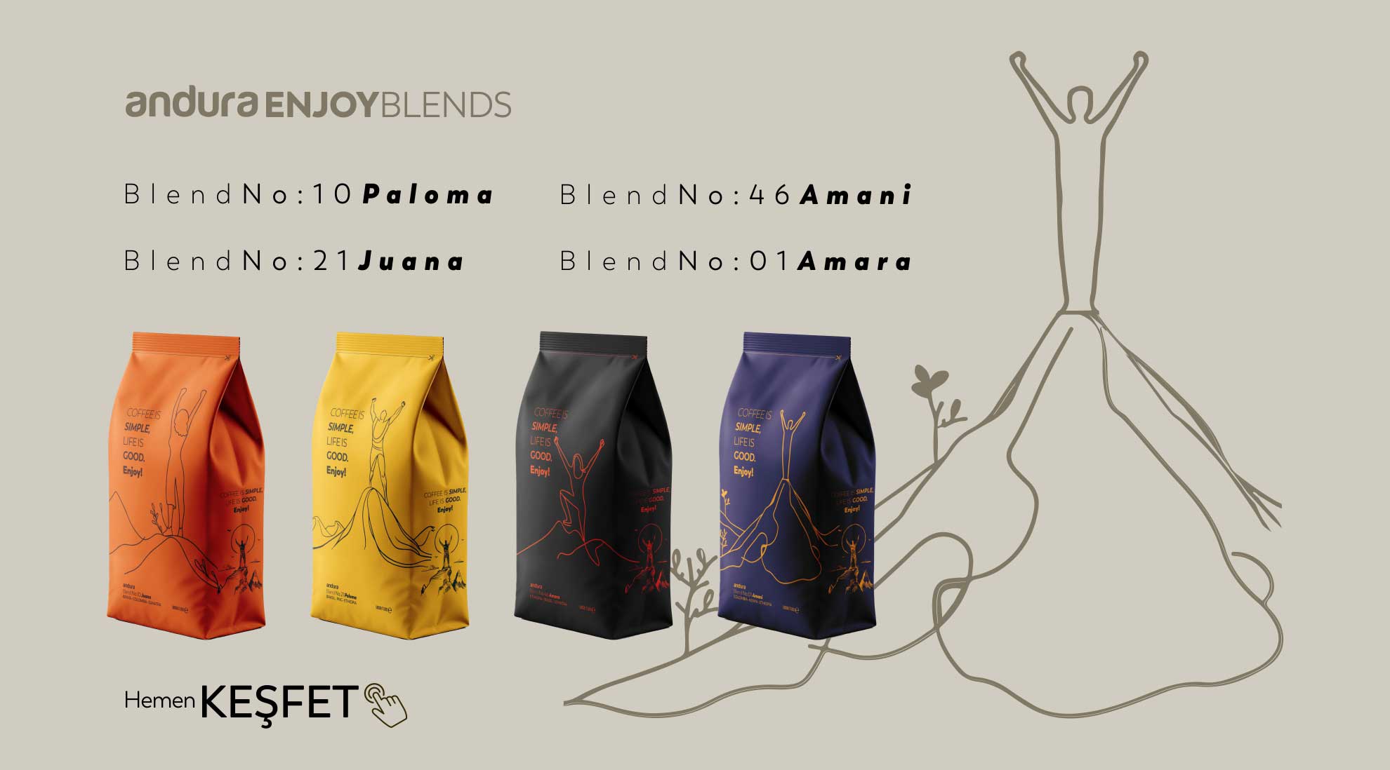 Enjoy Blends, farklı coğrafyaların karakterini tek bir fincanda dengeli bir uyuma dönüştüren harmanlardan oluşur. Her biri; gövde, asidite ve aromanın birbiriyle yarışmadığı, aksine birbirini tamamladığı bir içim sunmak için özenle tasarlandı. Amaç, karmaşıklık yaratmak değil; her yudumda kendini rahatça ifade eden, anlaşılır ve keyifli bir kahve deneyimi sunmak.